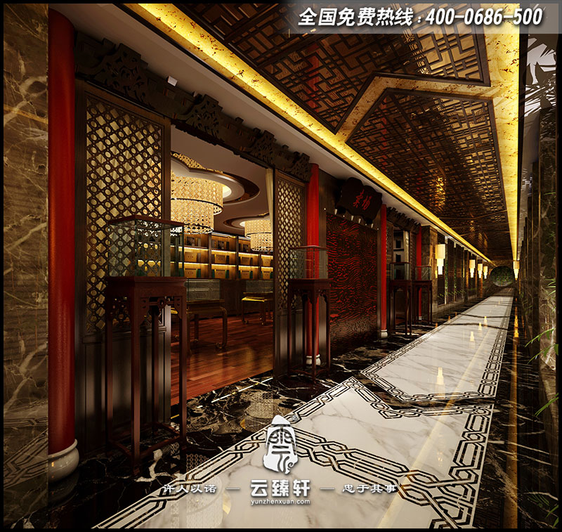 茶莊中式會(huì)所展廳入口,以中國(guó)傳統(tǒng)建筑經(jīng)典元素——紅柱、古門(mén)、雕檐、匾額等景觀鋪敘,來(lái)實(shí)現(xiàn)茶道文化對(duì)環(huán)境極致追求的空間表達(dá)